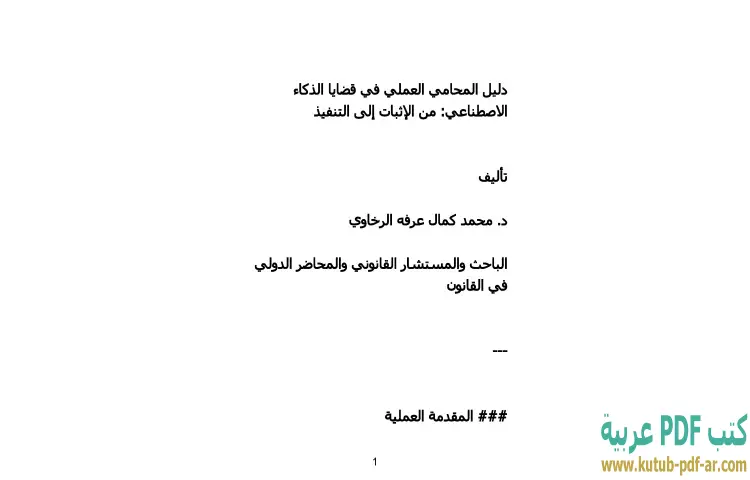 تحميل كتاب دليل المحامي العملي في قضايا الذكاء الاصطناعي PDF – محمد كمال الرخاوي – يعد كتاب "دليل المحامي العملي في قضايا الذكاء الاصطناعي" للدكتور محمد كمال الرخاوي مرجعًا هامًا للمحامين والمتخصصين في القانون الذين يسعون لفهم القضايا القانونية المتعلقة بالذكاء الاصطناعي. يقدم الكتاب رؤية شاملة حول كيفية التعامل مع المسائل القانونية التي تطرحها تكنولوجيا الذكاء الاصطناعي، موضحًا الإجراءات اللازمة من مرحلة الإثبات إلى التنفيذ.