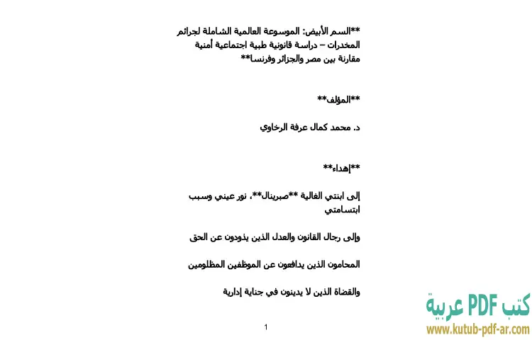 تحميل كتاب سم الأبيض PDF – محمد كمال الرخاوي – يقدم كتاب "سم الأبيض: الموسوعة العالمية الشاملة لجرائم المخدرات" دراسة متكاملة وشاملة حول ظاهرة المخدرات وتأثيراتها المتعددة على المجتمعات. يتناول الكتاب من خلال رؤى قانونية وطبية واجتماعية وأمنية مقارنة بين ثلاثة بلدان هي مصر والجزائر وفرنسا، مما يعكس التنوع في القوانين والسياسات المتبعة لمواجهة هذه الظاهرة.