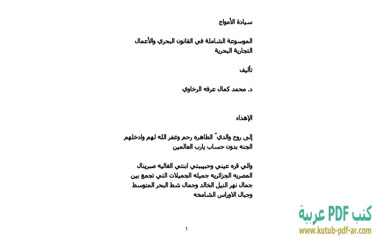 تحميل كتاب سيادة الأمواج PDF – محمد كمال الرخاوي – يعتبر كتاب "سيادة الأمواج: الموسوعة الشاملة في القانون البحري والأعمال التجارية البحرية" للمؤلف دكتور محمد كمال الرخاوي مرجعًا مهمًا في مجال القانون البحري. يتناول الكتاب مجموعة من الموضوعات الحيوية المرتبطة بالقانون البحري، حيث يقدم تحليلاً شاملاً للأبعاد القانونية المتعلقة بالأعمال التجارية البحرية. يسعى المؤلف إلى توضيح المفاهيم القانونية المعقدة بأسلوب سهل ومبسط، مما يجعله مناسبًا للمهتمين بمجال القانون، سواء كانوا طلابًا أو ممارسين.