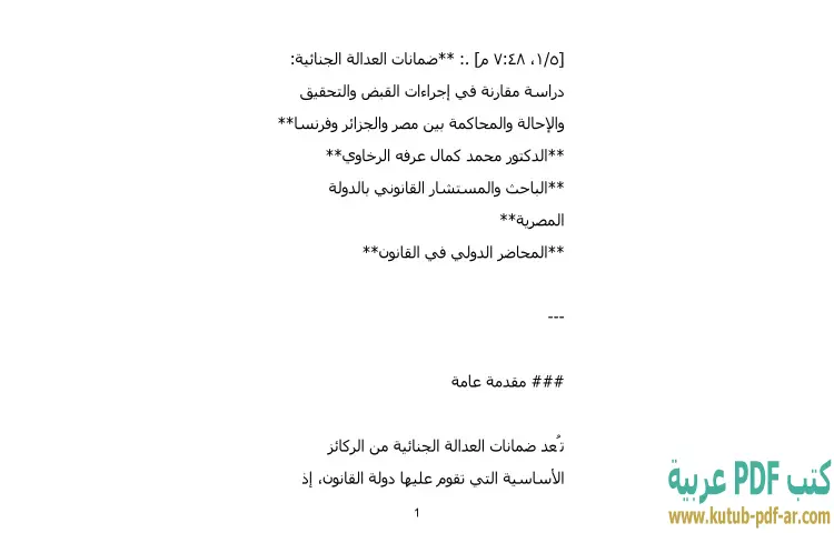 تحميل كتاب ضمانات العدالة الجنائية PDF – محمد كمال الرخاوي – يقدم الدكتور محمد كمال عرفه الرخاوي في كتابه "ضمانات العدالة الجنائية: دراسة مقارنة في إجراءات القبض والتحقيق والإحالة والمحاكمة بين مصر والجزائر وفرنسا" دراسة شاملة حول الضمانات القانونية التي تحمي الأفراد خلال مراحل العدالة الجنائية. يستند الكتاب إلى مقارنة دقيقة بين الأنظمة القانونية في ثلاث دول، مما يتيح للقارئ فهم الاختلافات والتشابهات في تلك الإجراءات. يتناول الكتاب كيفية تأثير هذه الضمانات على حقوق المتهمين والمجتمع بشكل عام، مما يوفر إطارًا قانونيًا يساعد على تعزيز العدالة والتوازن بين حقوق الأفراد وواجبات السلطات.