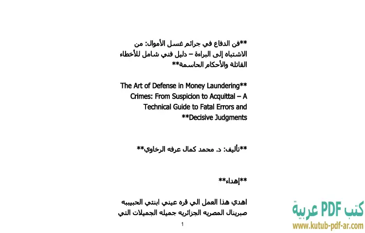 تحميل كتاب فن الدفاع في جرائم غسل الأموال PDF – محمد كمال الرخاوي – يقدم كتاب "فن الدفاع في جرائم غسل الأموال: من الاشتباه إلى البراءة" للدكتور محمد كمال الرخاوي دليلاً فنياً شاملاً يستعرض فيه الأخطاء القاتلة والأحكام الحاسمة المتعلقة بقضايا غسل الأموال. يتناول الكتاب موضوعاً حيوياً في مجال القانون الجنائي والمالي، حيث يسلط الضوء على الجوانب القانونية والعملية المتعلقة بالدفاع عن المتهمين في هذه الجرائم، مما يجعله مرجعاً مهماً للمحامين والمهتمين بهذا المجال.