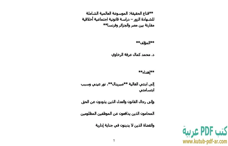 تحميل كتاب قناع الحقيقة PDF – محمد كمال الرخاوي – في كتاب "قناع الحقيقة: الموسوعة العالمية الشاملة للشهادة الزور"، يقدم الدكتور محمد كمال الرخاوي دراسة قانونية واجتماعية وأخلاقية تتناول قضية الشهادة الزور وتأثيراتها في كل من مصر والجزائر وفرنسا. يستعرض الكتاب الأبعاد المختلفة لهذه الظاهرة، حيث يسلط الضوء على الجوانب القانونية المتعلقة بالشهادة الزور، وما يترتب عليها من عقوبات وآثار سلبية على العدالة والمجتمع.