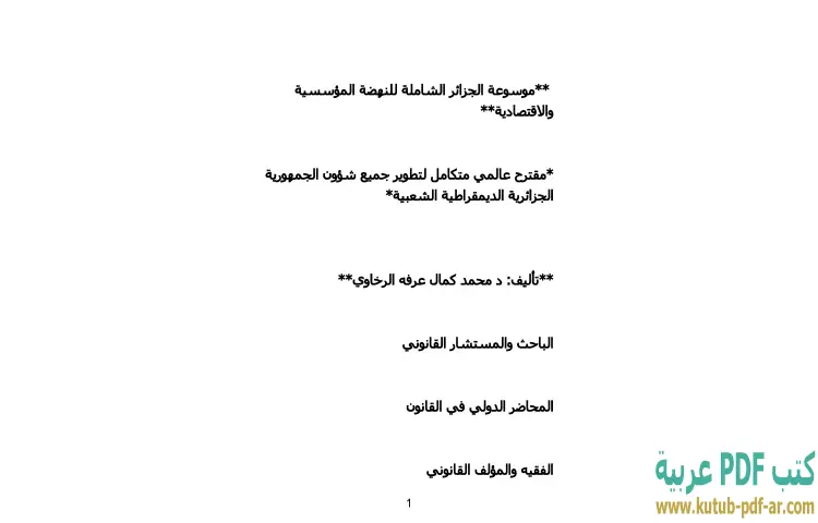تحميل كتاب موسوعة الجزائر الشاملة للنهضة المؤسسية والاقتصادية PDF – محمد كمال الرخاوي – موسوعة الجزائر الشاملة للنهضة المؤسسية والاقتصادية للدكتور محمد كمال الرخاوي تعدّ مرجعًا مهمًا في مجال التنمية الاقتصادية والإصلاح المؤسسي. يقدم المؤلف رؤية شاملة حول التحديات التي تواجه الجزائر في عصر العولمة وكيفية التعامل معها من خلال استراتيجيات متكاملة تهدف إلى تعزيز النمو الاقتصادي وتحقيق التنمية المستدامة. تتناول الموسوعة مجموعة من الموضوعات التي تشمل السياسات الاقتصادية، إدارة الموارد، وتفعيل دور المؤسسات في تعزيز الاقتصاد الوطني.