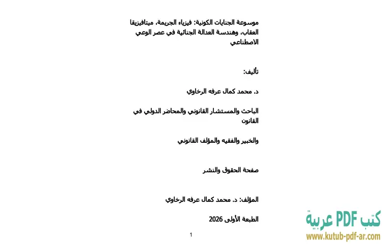 تحميل كتاب موسوعة الجنايات الكونية PDF – محمد كمال الرخاوي – "موسوعة الجنايات الكونية: فيزياء الجريمة، ميتافيزيقا العقاب، وهندسة العدالة الجنائية في عصر الوعي الاصطناعي" هو عمل فكري يقدمه دكتور محمد كمال الرخاوي، حيث يتناول فيه موضوعات معقدة تمزج بين العلوم الطبيعية وعلوم الاجتماع. الكتاب يسعى لاستكشاف العلاقة بين الجريمة والفيزياء، مقدماً رؤية جديدة لكيفية فهم الظواهر الإجرامية من منظور علمي دقيق. يركز الرخاوي على كيفية تأثير التغيرات التكنولوجية والوعي الاصطناعي على طبيعة الجريمة وأساليب العقاب، مما يفتح آفاقًا جديدة للنقاش حول العدالة الجنائية.