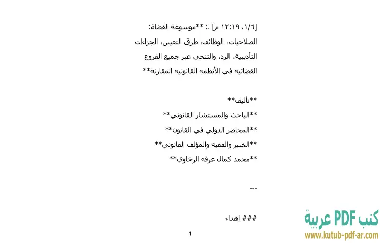 تحميل كتاب موسوعة القضاة PDF – محمد كمال الرخاوي – تقدم "موسوعة القضاة" للدكتور محمد كمال الرخاوي دراسة شاملة حول القضاة، تتناول الصلاحيات والوظائف التي يمارسها القضاة في مختلف الأنظمة القانونية. يسعى الكتاب إلى تقديم رؤية واضحة حول كيفية تعيين القضاة، والطرق المتبعة في هذا الشأن، مستعرضًا أبرز المعايير التي تسهم في اختيار الأفراد المناسبين لشغل هذه المناصب الحساسة.
