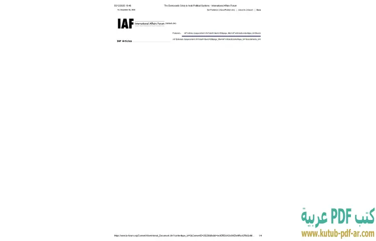 تحميل كتاب The Democratic Crisis in Arab Political Systems PDF – محمد عادل زكي – يتناول كتاب "The Democratic Crisis in Arab Political Systems" للمؤلف محمد عادل زكي موضوعًا حيويًا يتمحور حول الأزمات الديمقراطية التي تعاني منها الأنظمة السياسية في العالم العربي. يستعرض الكتاب الظروف السياسية والاجتماعية التي ساهمت في تفشي هذه الأزمات، ويحلل العوامل الداخلية والخارجية التي أثرت على عملية التحول الديمقراطي في المنطقة. يقدم زكي رؤية شاملة للأوضاع الراهنة، مستندًا إلى العديد من الدراسات والأبحاث التي تسلط الضوء على التحديات التي تواجه المجتمعات العربية.